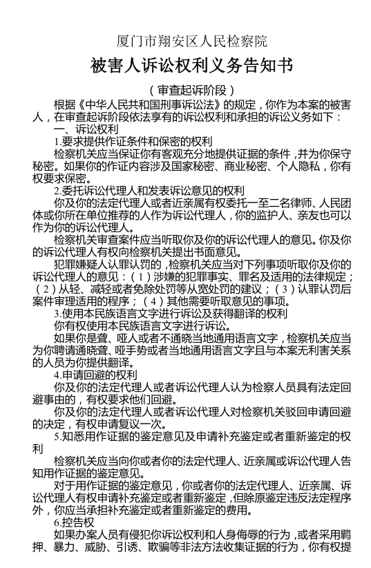 犯罪嫌疑人吉拉石热、吉支木乃、木呷加拿、阿木子且、学以子、吉克尔布涉嫌诈骗、敲诈勒索罪一案,已由厦门市公安局翔安分局侦查终结并移送本院审查起诉。因本案被害人人数众多且分布范围广,无法逐一送达相关法律文书,根据《中华人民共和国刑事诉讼法》的相关规定及《人民检察院刑事诉讼规则》第五十五条的规定,现采取公告送达方式告知被害人在审查起诉阶段享有的诉讼权利和义务(内容详见《厦门市翔安区人民检察院被害人诉讼权利义务告知书》)。