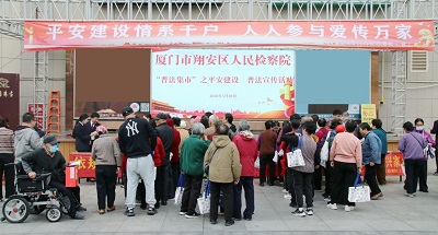 3月20日,翔安区闽篮城市广场人头攒动,笑语不断。一场由翔安区检察院主办、金海街道鼓岩社区居民委员会协办的“平安建设”普法集市活动正火热进行。检察干警化身“普法摊主”,以“摆摊设点、游戏互动、有奖问答、现场答疑”的生动形式,将法律服务送到群众身边,让法治意识在轻松氛围中浸润人心。